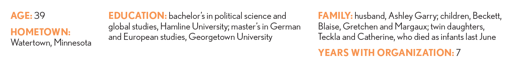 Getting here: She worked as chief of staff for the U.S. Department of State’s Bureau of Energy and as an advance lead to President Barack Obama, a role in which she handled preparations for the president’s domestic and foreign travel. When Obama left office in 2017, Richter-Garry moved to Indiana with her husband for his job. Lots of networking led to her current role.