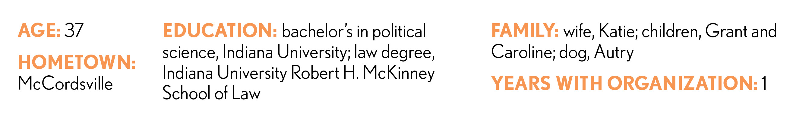 Givebacks: board member of Junior Achievement of Central Indiana, member of the Indiana Gaming Commission, member of the McCordsville Economic Development Commission