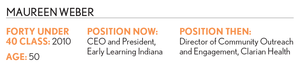 When IBJ recognized Maureen Weber as a Forty Under 40 honoree in 2010, she had just finished reorganizing the Indiana Department of Education and had taken a job as director of community outreach and engagement at Clarian Health, now Indiana University Health.