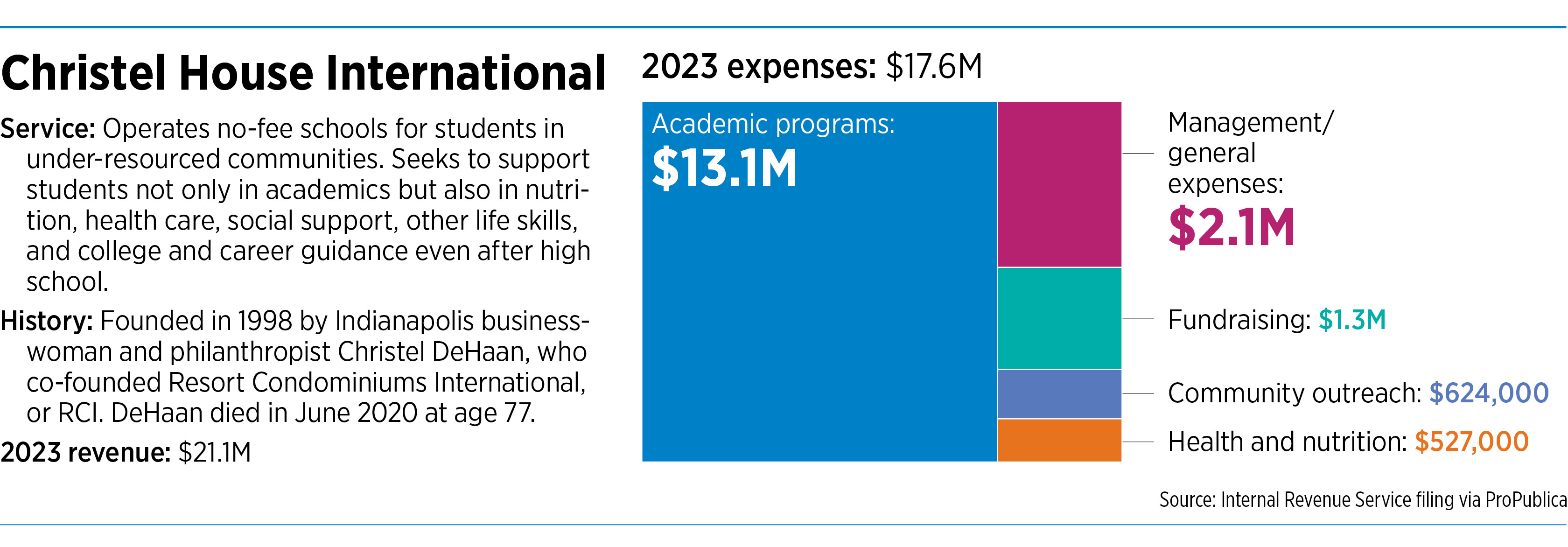 In 2023, Christel House International reported revenue of $21.1 million with expenses of $17.6 million, according to its IRS filing.
