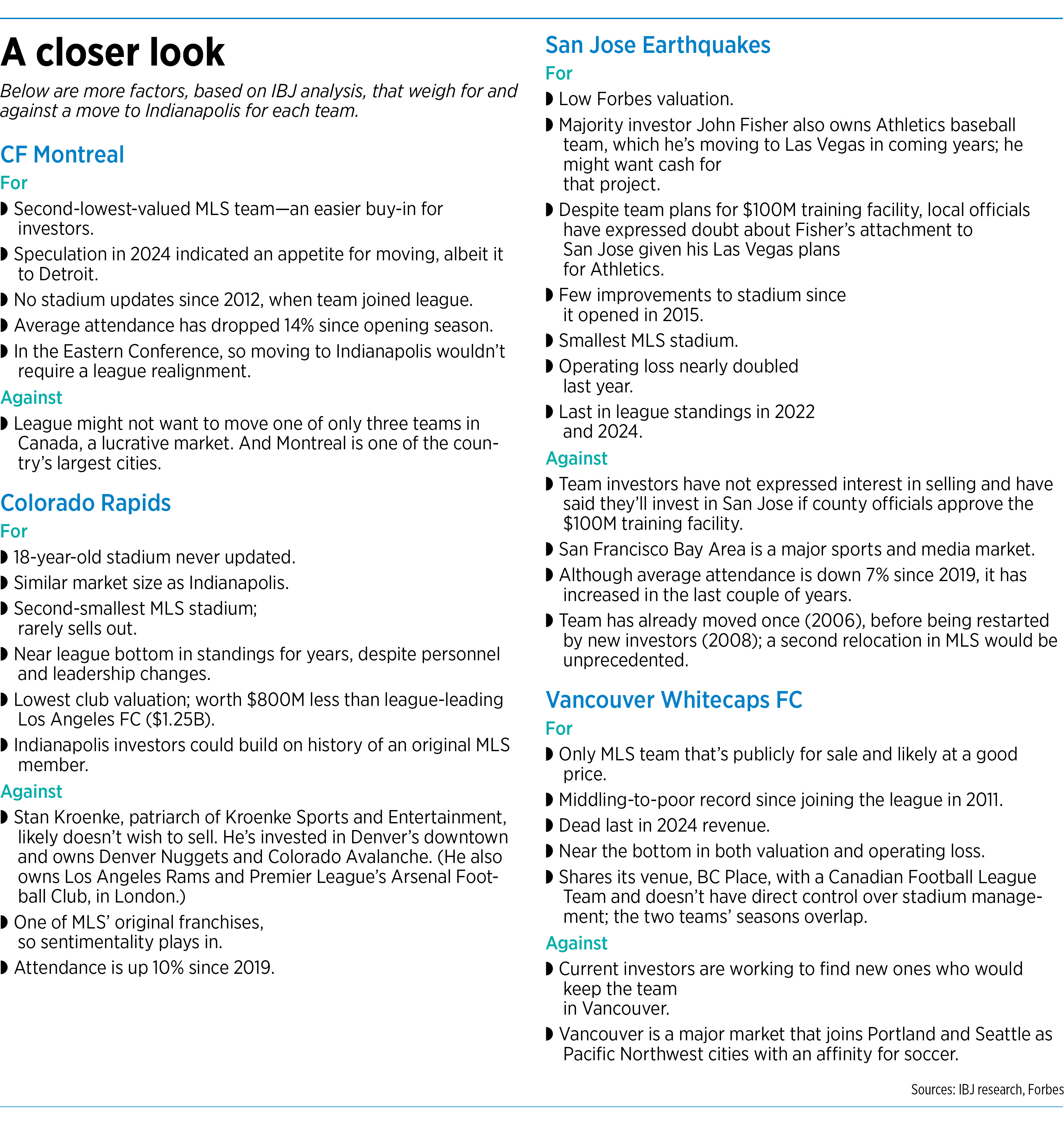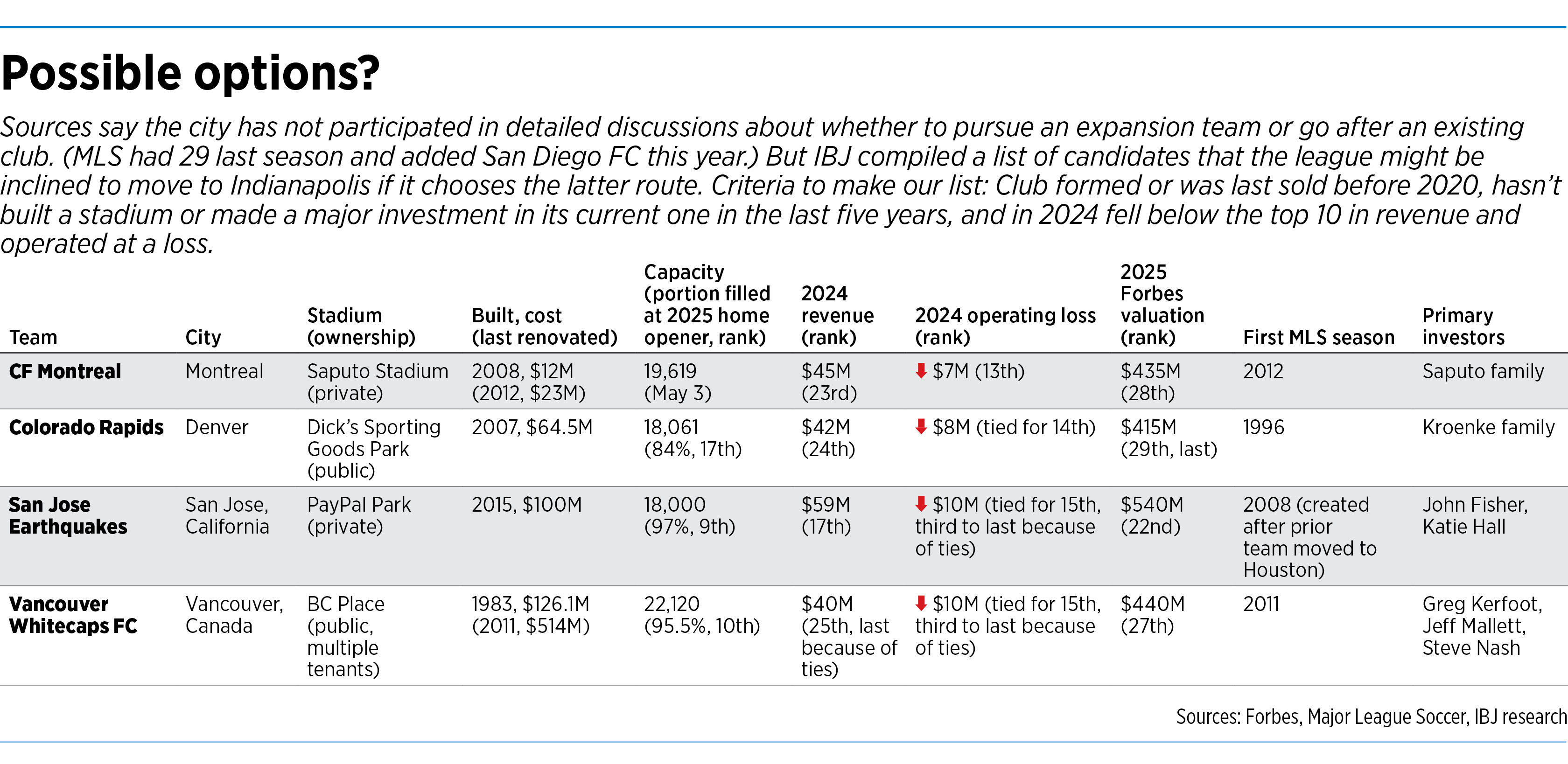 Two sources close to that group told IBJ the investors are exploring their role in both team options: an MLS expansion and bringing a team from another city.