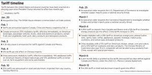 On March 4, President Donald Trump placed 25% tariffs on some imports from Canada and Mexico. However, two days later, he abruptly put those on hold until April 2. Twenty-percent tariffs on Chinese imports are in effect. And 25% tariffs on all steel and aluminum imports started March 12.